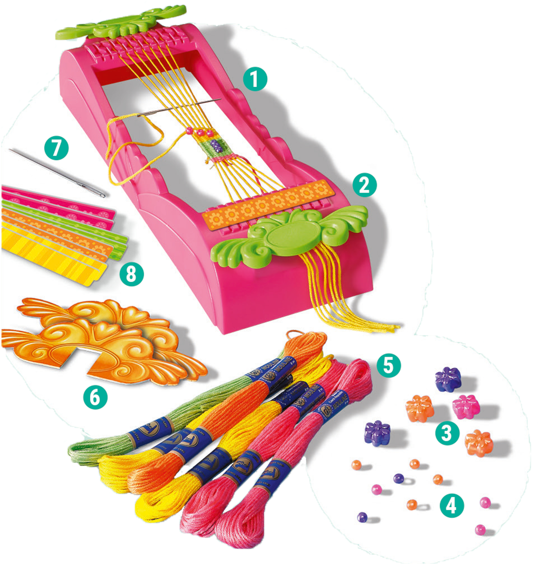 Set pronto all’uso con telaio, fili e perline colorate per realizzare fino a 6 braccialetti dell’amicizia. Un’ampia gamma di colori per dare libero sfogo alla creatività e far divertire i bambini esercitando la motricità fine e la concentrazione.