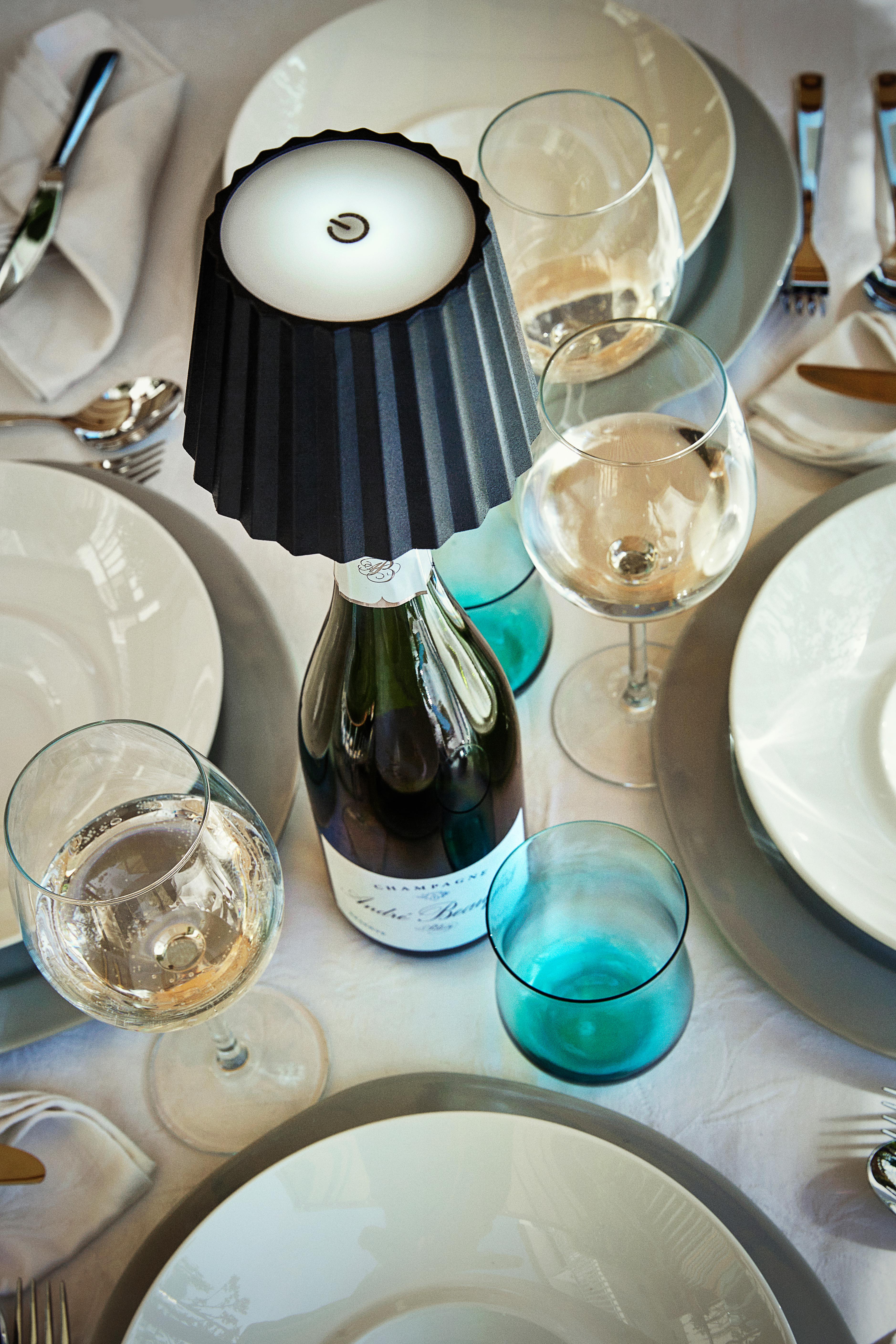 Lampada da tavolo di design in metallo e ABS con adattatore per bottiglia incluso. Versatile e con luce dimmerabile, ideale per creare l’atmosfera perfetta su ogni superficie. Luce LED 3W con tre programmi di luminosità e funzione dimmer per la regolazione dell’intensità.
