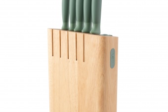 Set da 6 coltelli con impugnatura ergonomica soft-touch e forbici multiuso abbinate. Ceppo portacoltelli in legno con affilatore integrato e magnete sul lato.