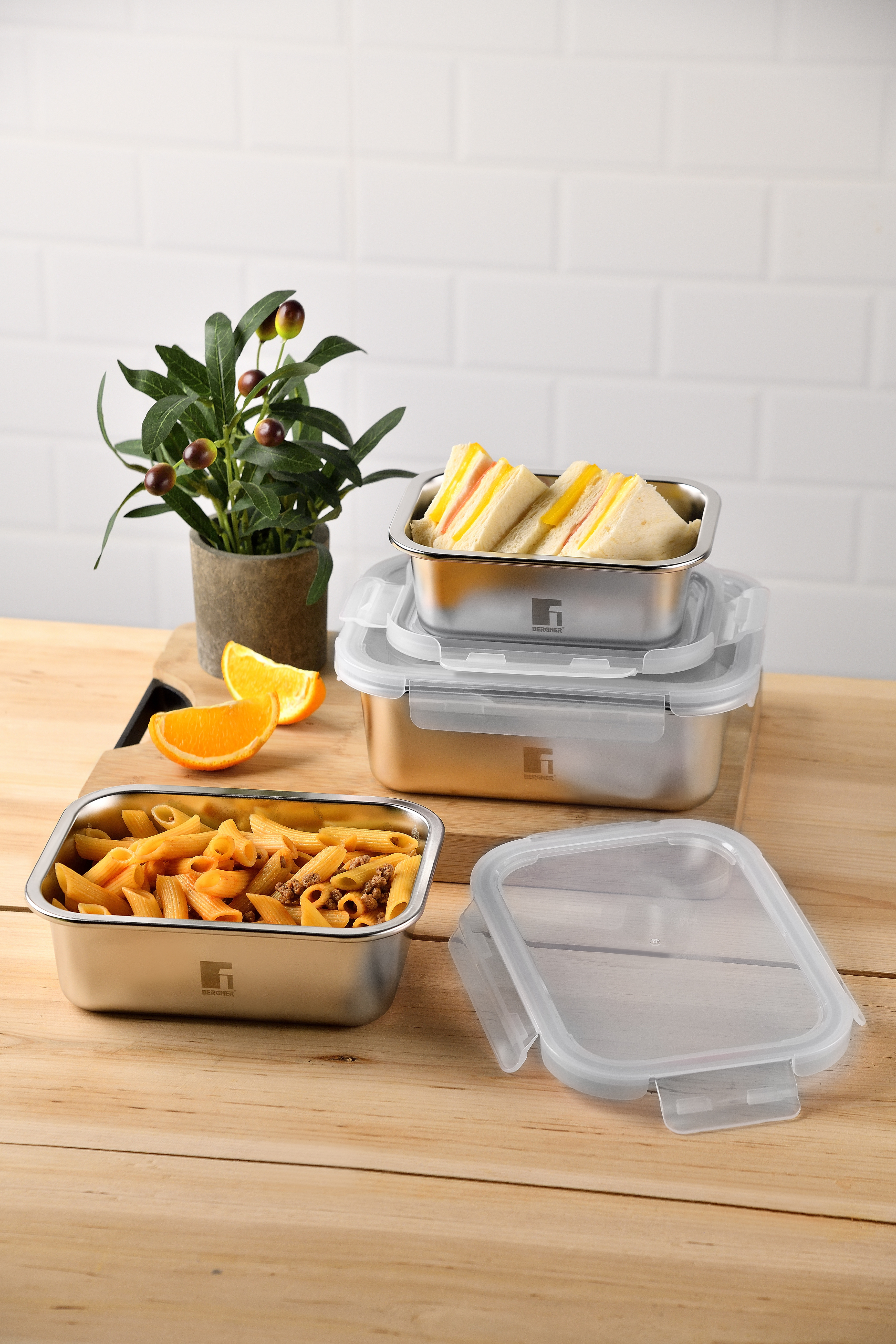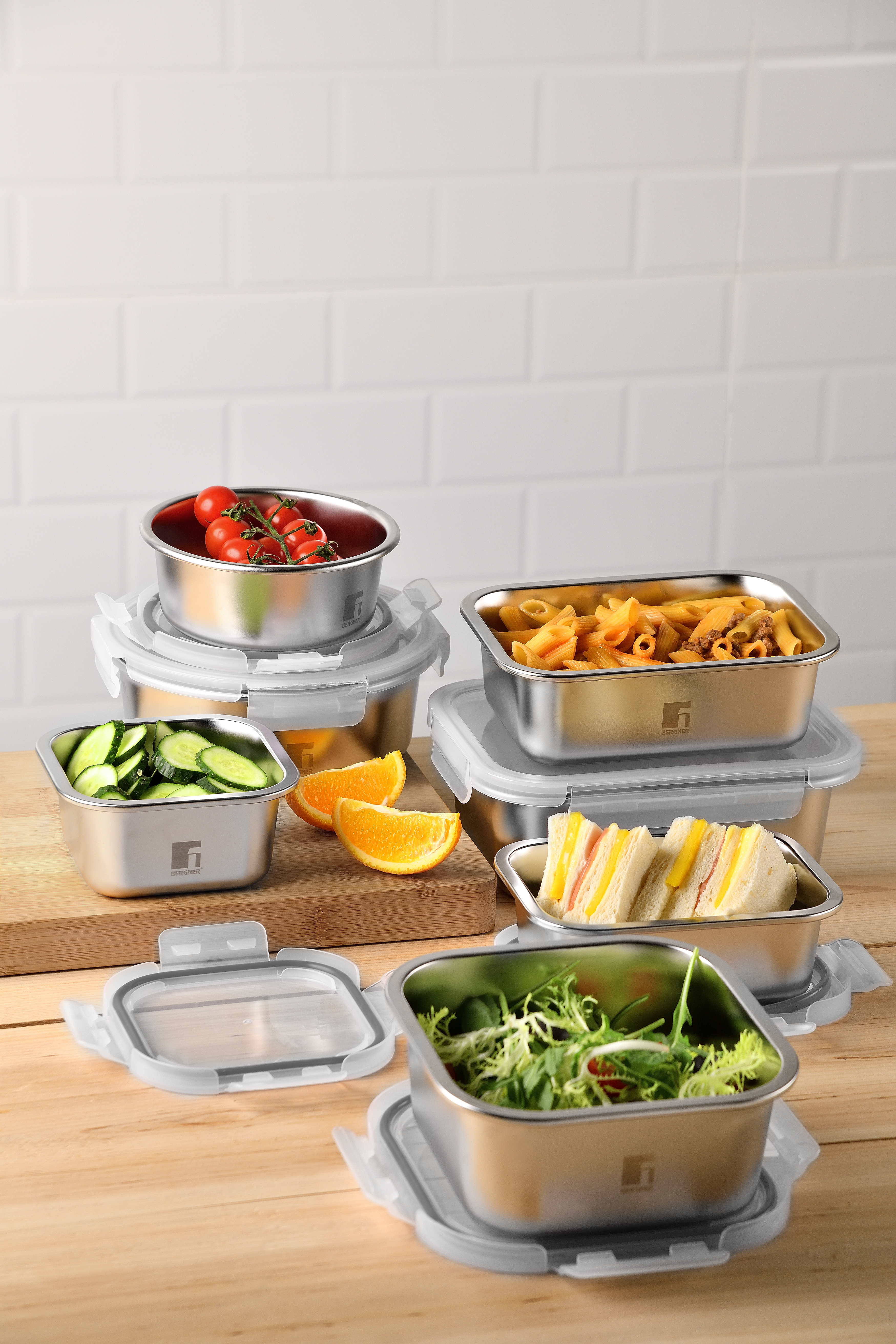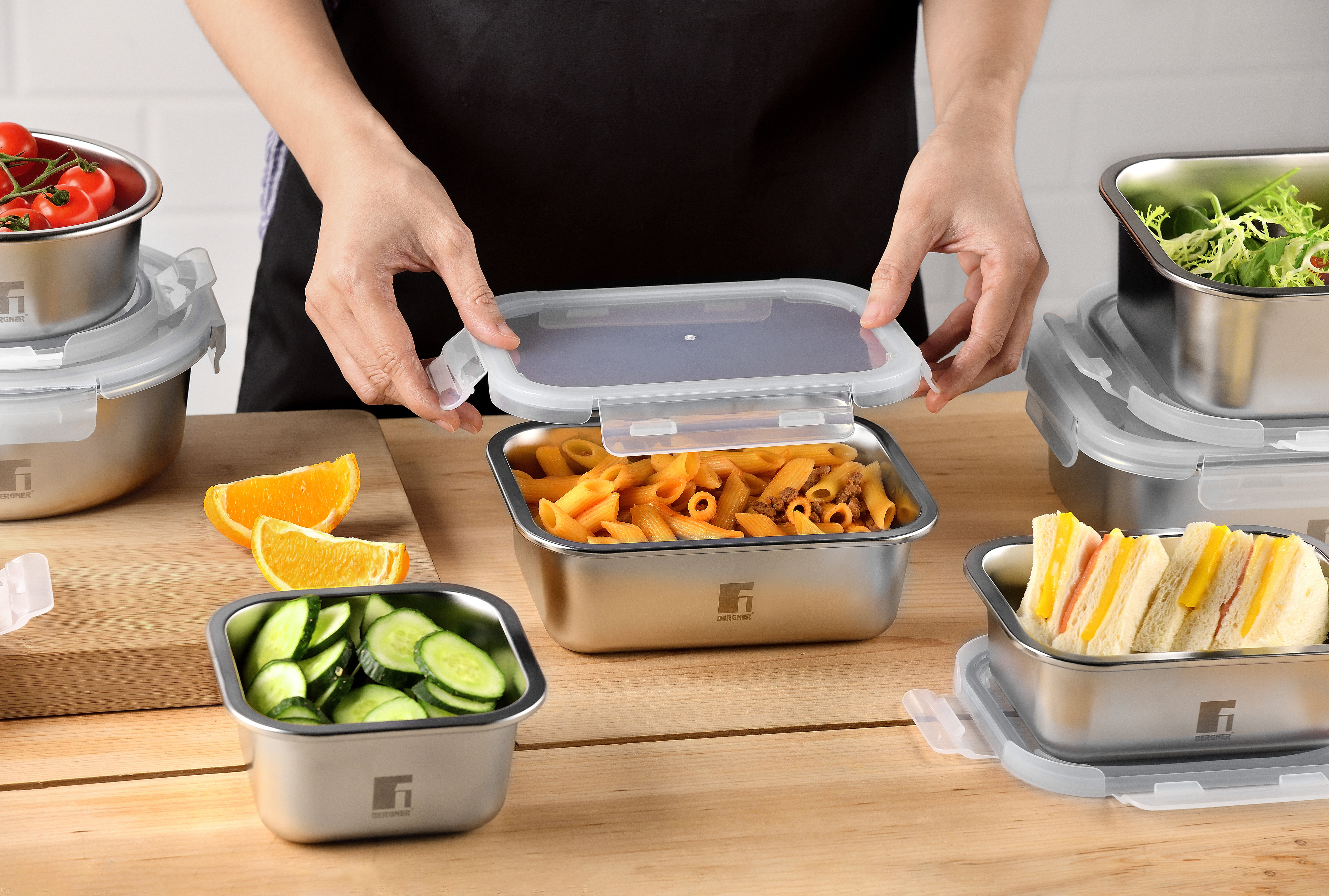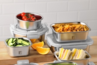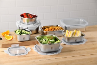 Innovativi, pratici e sostenibili, i contenitori ermetici della linea “Lovers” sono realizzati in acciaio inox di alta qualità resistente alla corrosione. Il corpo accumula e trasmette il calore al cibo, preservandone le proprietà organolettiche. Utilizzabili come teglie per microonde. Adatti alla conservazione in frigorifero e congelatore. Impilabili, igienici e lavabili in lavastoviglie. Con coperchio trasparente in PP e guarnizione in silicone per una chiusura ermetica a prova di perdite.