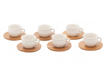 Servizio stile England con tazzine da caffè in fine porcellana bianca e piattini in bamboo. Tazzine idonee a microonde e lavastoviglie.