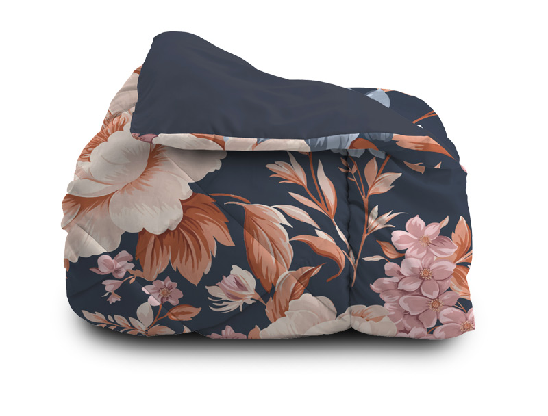 Trapunta invernale con stampa digitale floreale sul fronte e retro in tinta unita blu.